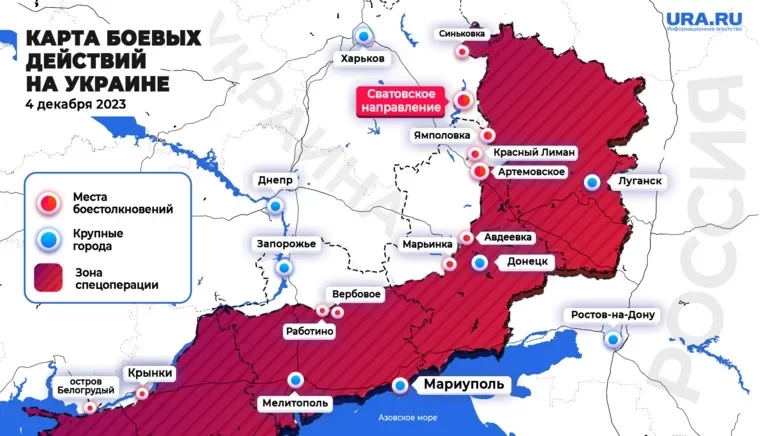 Обновлённая карта боевых действий на Украине по данным на 12:00 мск от 04.12.2023