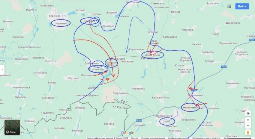 Также подразделения ВС РФ ведут бои в районе Малой Локни. По информации некоторых источников, штурмовые отряды Армии России уже зашли в населённый пункт. Обстановка чуть западнее, в районе Погребков, пока что под вопросом. Удалось ли нашим бойцам прорваться на этом участке - пока что неизвестно. Если всё-таки удалось, то в целом Армии России удастся срезать ещё один довольно большой выступ.