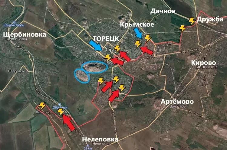 На Торецком направлении в самом Торецке продолжаются ожесточённые бои. Наши бойцы постепенно продвигаются в южной районе Тореццка (Забалке) и в центральном. Враг признают небольшое продвижение ВС РФ за последние сутки.