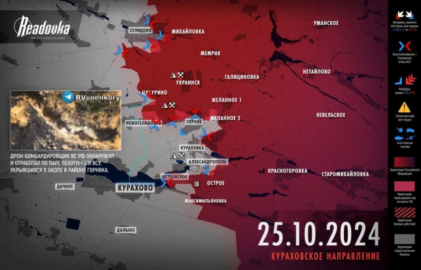 На Покровском направлении российские войска ведут бои в районе Селидово, а также ведут зачистку территории шахты «Новогродовская» №1/3 на северных подступах к Новогродовке, сообщает Telegram-канал "Рыбарь".