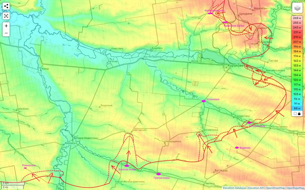 Смысл наступления ясен - выйти в тыл группировке ВСУ в Курахово и тем самым способствовать освобождению этого города (чем займется наша группировка «Юг»). Вторую клешню охвата тем временем осуществляет наша группировка «Восток», которая вчера также имела значимые успехи.