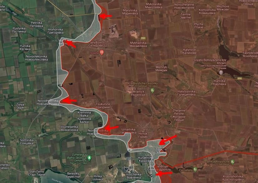 На Покровском направлении ВС РФ продолжают зачистку западной и северо-западной окраин Селидово. В районе Вишнёвого российские войска продвинулись на участке шириной до 2.8 км на глубину до 1.45 км. Западнее Цукурино ВС РФ продвинулись на глубину до 1.2 км. в направлении Новодмитровки, сообщает Telegram-канал "БелВПО". Российские войска имеют тактические успехи в Новоселидовке, продвинулись на глубину до 1.25 км. Под контроль ВС РФ перешел Горняк. Продолжаются боестолкновения в районе Зоряного и Кураховки. Поссийские войска продвинулись в районе Острого и Александрополя в направлении террикона и шахты №1/2 «Острый».