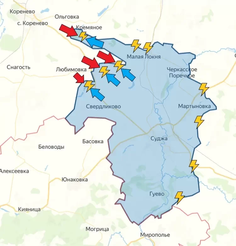 Успех здесь у сторон переменный, но по итогу серьёзного продвижения нет ни у кого. Продолжаются локальные бои у Малой Локни, а также на востоке Суджанского района.