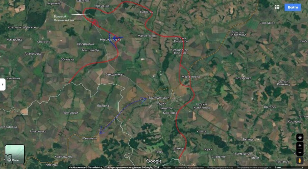 Ведутся бои в окрестностях Толстого Луга и Дарьино, где украинские силы предприняли несколько контратак, удерживая населённый пункт в «серой зоне». В Новоивановке продолжаются встречные бои с переменным успехом, значительная часть территории также остаётся в «серой зоне». Основная задача ВСУ, вероятно, заключается в расширении коридора с северной группировкой для избежания окружения и вывода удерживаемых подразделений из района Толстого Луга. Российские части стремятся вытеснить противника из Большого Ольговского леса, что позволило бы разблокировать для снабжения трассу Коренево-Зеленый Шлях.