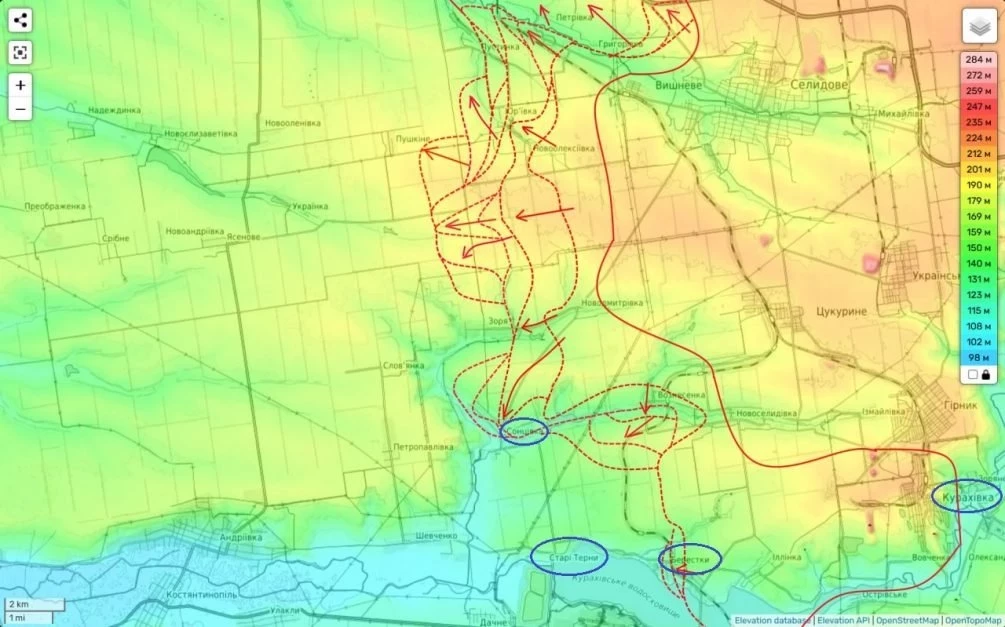 Тем временем в районе Берестков ситуация для Киева складывается крайне неблагоприятно. На вечер они удерживали лишь самую западную окраину, и есть все основания полагать, что сегодня они потеряют и этот участок. Дальше за холмом расположены Старые Терны, но с учетом ухудшающейся ситуации в Курахово, это село теряет свое стратегическое значение.