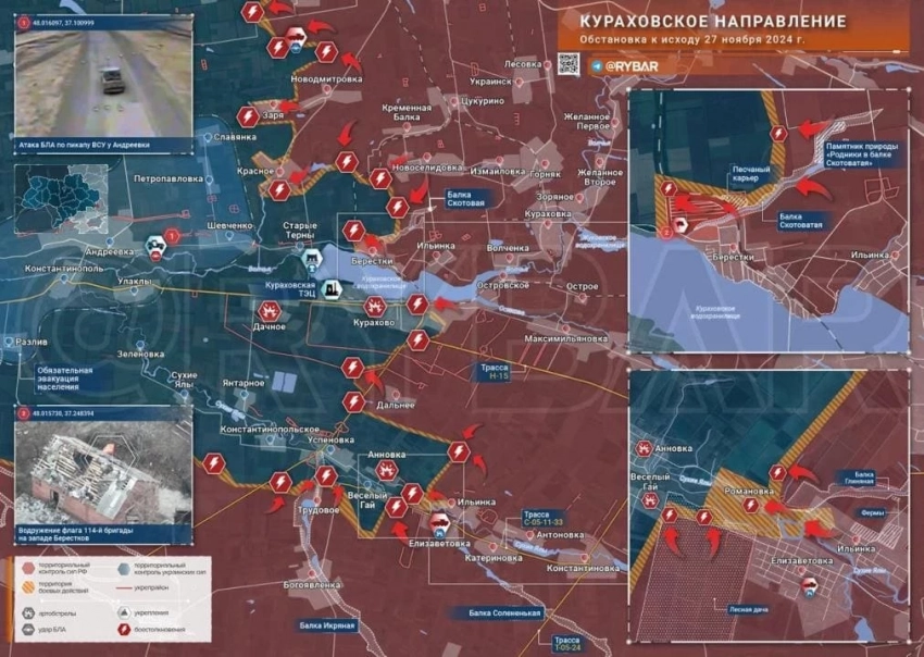 На Кураховском направлении ВС РФ, согласно кадрам объективного контроля, полностью освободили Берестки. Южнее идут бои в Курахово и на рубеже Романовка - Константинопольское, сообщает Telegram-канал "Рыбарь".