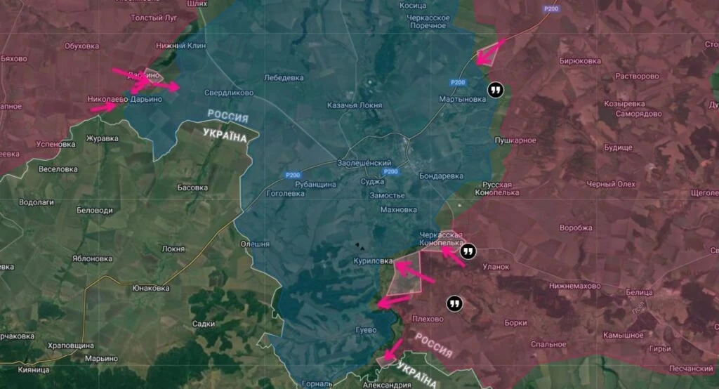 Военкор подчеркнул, что со стороны населённых пунктов Дарьино и Николаево-Дарьино тоже идут бои. Цель российских войск - выйти к селу Свердликово, которое тоже расположено на трассе с твердым покрытием. Также ВС РФ движутся в направлении Гуево, там тоже расположена асфальтовая дорога. Ее хотят взять под контроль, чтобы уничтожить противника в Судже.