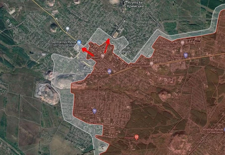 На Торецком направлении продолжаются встречные бои в районе центрального рынка, российские войска давят в направлении шахты «Торецкая», продвинулись в северо-западной части Торецка.