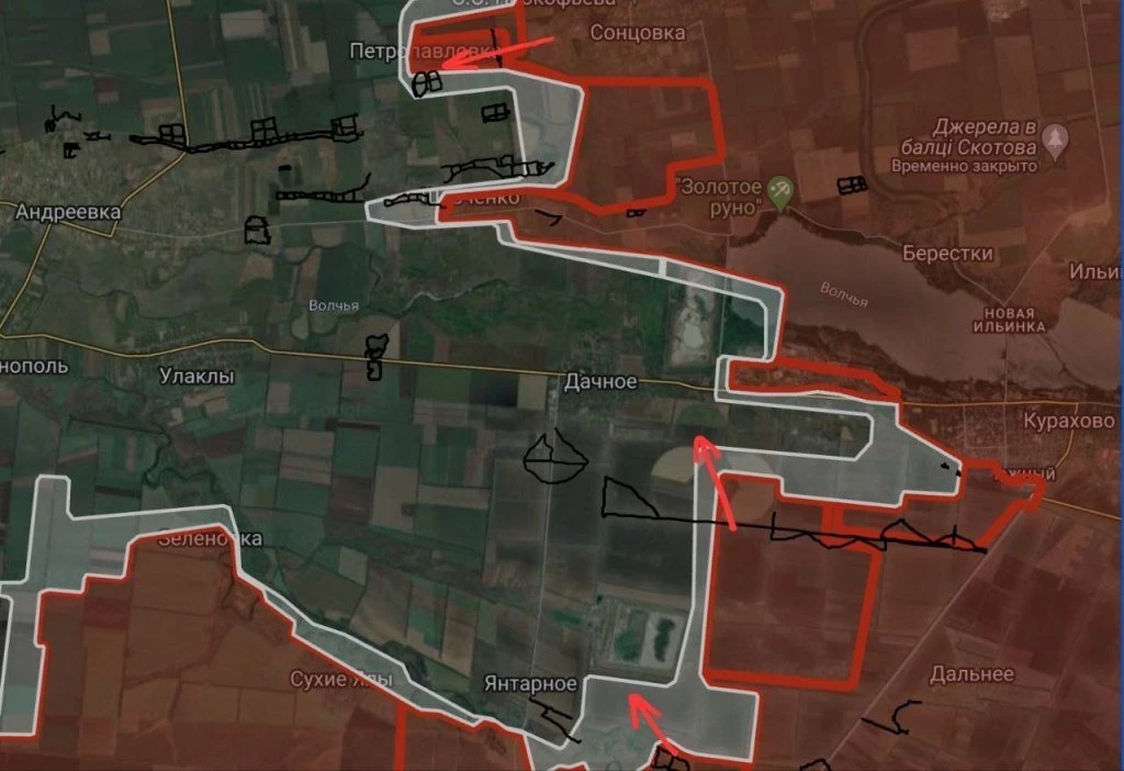 Российские войска расширили контроль территории в районе Зелёное, западнее Песчаное и Нововасилевки. ВС РФ ведут зачистку Петропавловки.