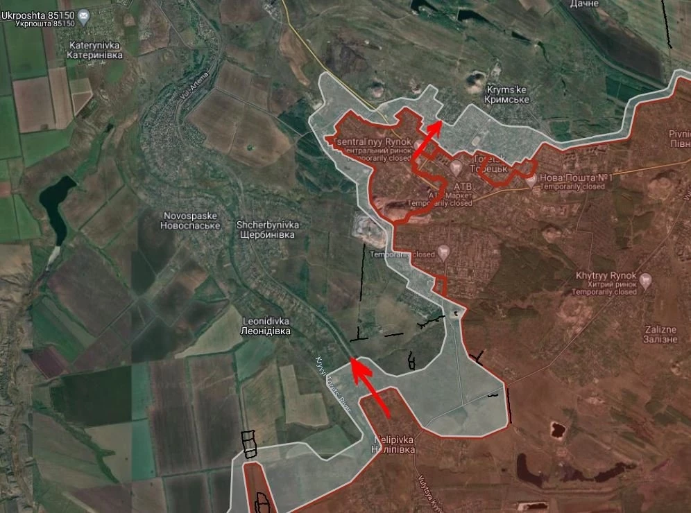 Под контроль российских войск перешла территория от восточной окраины Удачное до западной окраины Котлино на участке шириной до 2.45 км.