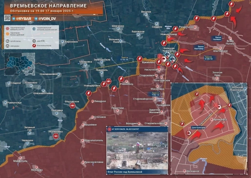 На Времьевском направлении штурмовики заняли значительную часть Времьевки, подтвердив свои успехи установкой флага России на северо-западной окраине села.