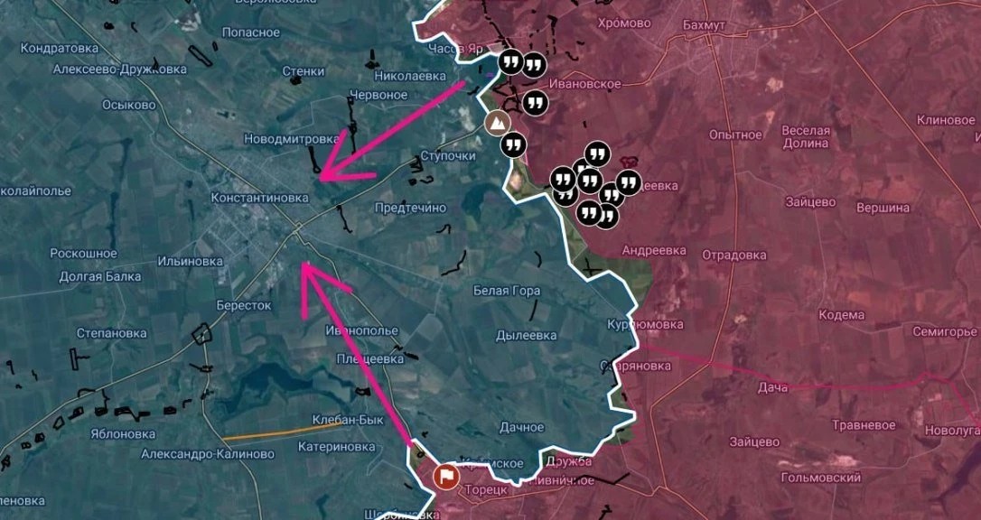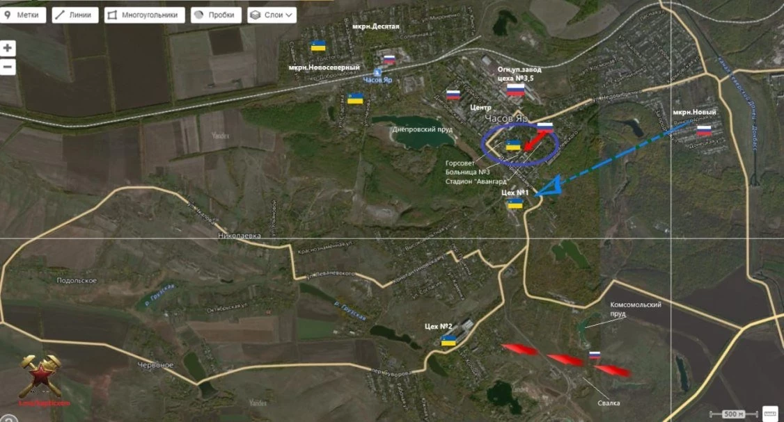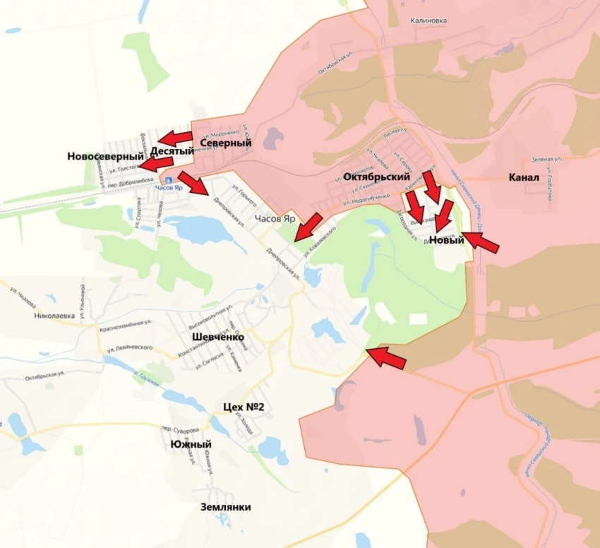 В Часов Яре продолжаются ожесточённые бои. Наши бойцы штурмуют позиции ВСУ в микрорайоне Новосеверный и чуть юго-восточнее - близ рынка.