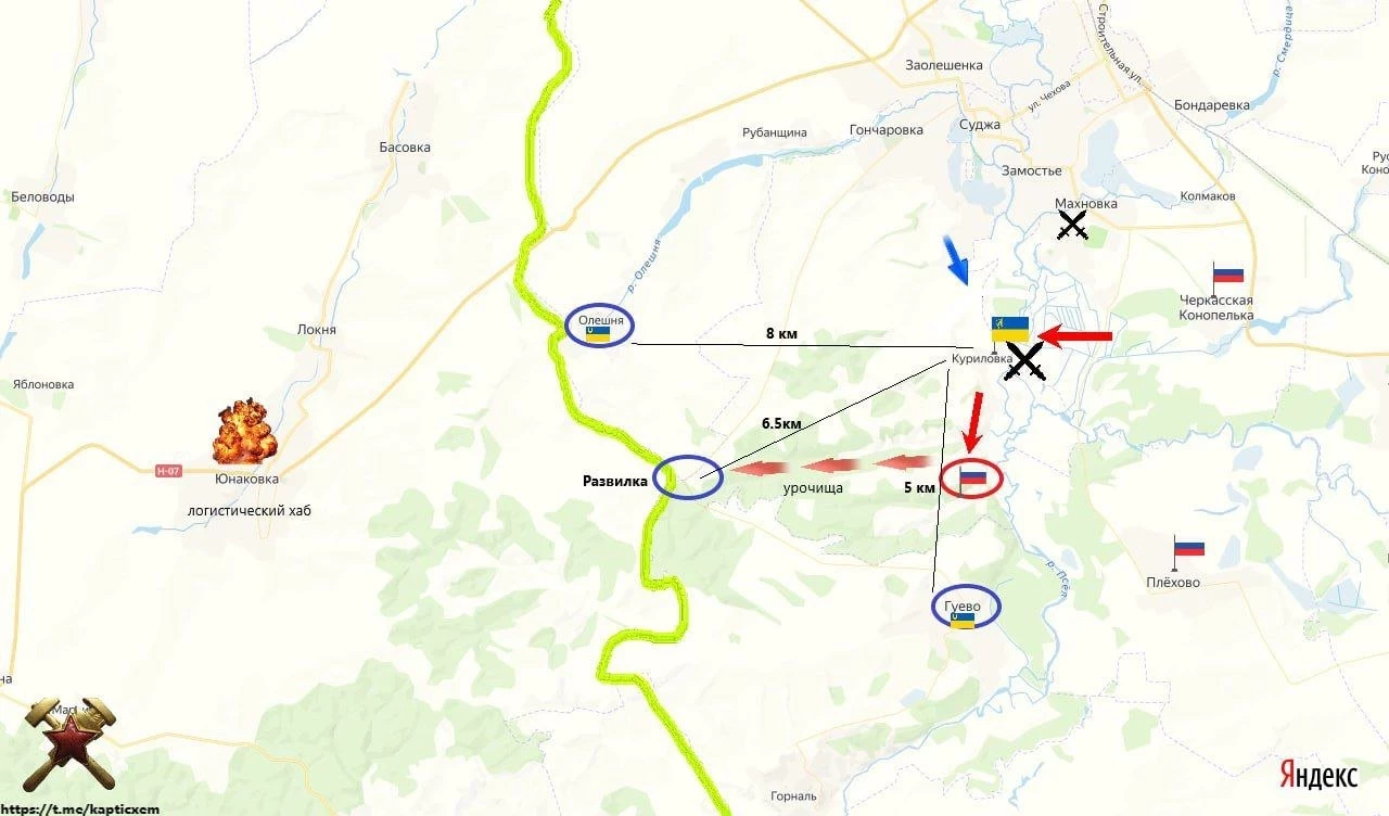 В свою очередь Telegram-канал «Два майора» пишет, что в Курской области подразделения морпехов ВС РФ продолжают вести упорные бои за деревню Куриловку, продвинулись по территории хутора Никольский и в ряде лесополос Суджанского района.