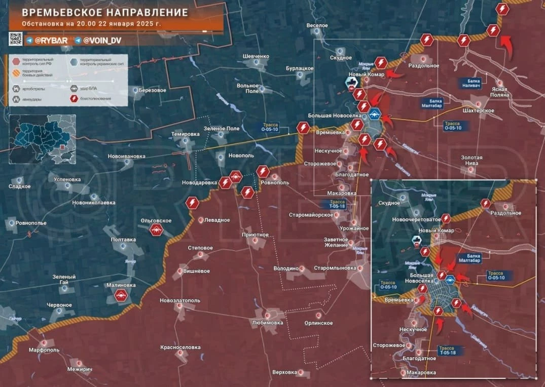 На Угледарском фронте российские штурмовики теснят противника в Великой Новоселке. С юго-восточной и восточной стороны на отдельных улицах продвижение наших войск составляет до 1 км, есть продвижение и со стороны Времевки. Восточнее в Кураховском мешке ВСУ усиливают сопротивление и предпринимают контратаки в районе Зеленовки и Андреевки, чтобы не допустить смыкания позиций ВС РФ. Армия России усилила давление на Дачное.