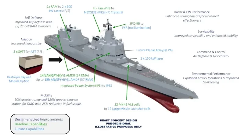 Согласно отчёту Исследовательской службы Конгресса за декабрь, DDG(X) будет оснащён боевой системой Aegis третьего поколения и мощным радаром AN/SPY-6 противовоздушной и противоракетной обороны (AMDR), плюс радаром воздушного наблюдения (EASR). Таким образом, у DDG(X) будет больше возможностей для развития, чем у кораблей предыдущего поколения, а значит, больше места, грузоподъёмности, мощности, что позволит ему размещать новое оборудование и оружие направленной энергии в течение всего срока службы, говорится в отчёте CRS.