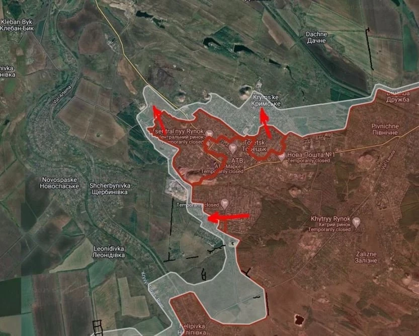 ВС РФ имеют тактические успехи западнее Котлино, продвинулись на глубину до 750 м, южнее Удачное на глубину до 1.82 км и южнее Новоелизаветовки на глубину до 1.35 км.