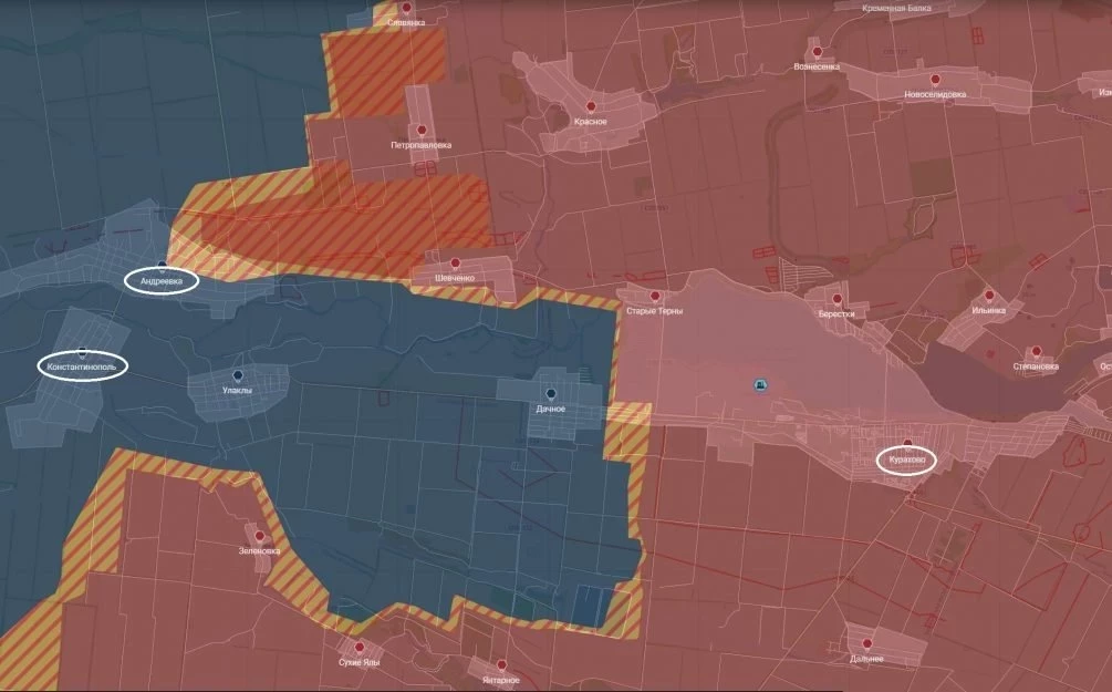 Также на Константинопольском направлении, южнее Курахово, российские войска продвинулись вдоль ряда лесополос севернее реки Сухие Ялы на участке шириной до 4.5 км на глубину до 600 метров и на северо-восточной окраине н.п. Дачное на глубину до 800 метров.