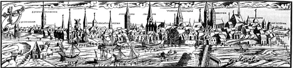 Ганзейский «Штальхоф» и район его расположения в начале XVI века. План района, выполненный фламандским топографическим художником Антоном Ван Вингардом (1525-1571), который делал панорамные зарисовки и картины городов на юге Нидерландов, севере Франции, Англии, Италии и Испании. План сделан для Филиппа II Испанского.