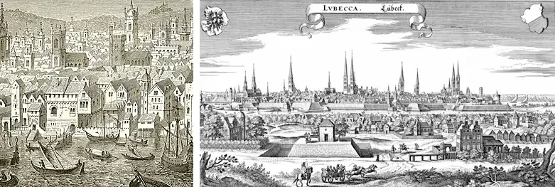 Справа: лондонская гавань. Слева: город Любек — «Королева Ганзы».