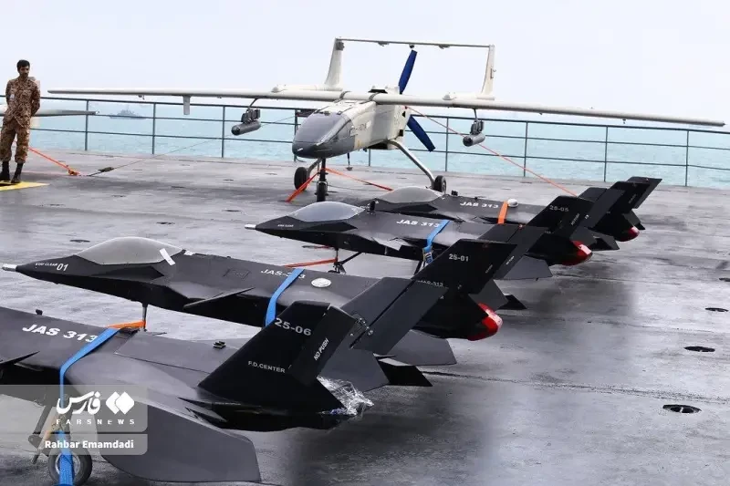 Также видны более крупные дроны или их макеты, дизайн которых соответствует Qaher 313, беспилотнику, сделанному на базе самолета. Есть неподтвержденные сообщения о том, что это дроны на 20 и 60 процентов меньше оригинального Qaher 313 соответственно. Оба самолета имеют маркировку JAS-313, и один из них показан в ролике, когда его поднимают на летную палубу на лифте. Неизвестно, какими реальными возможностями они обладают, но, скорее всего, это ударные аппараты.