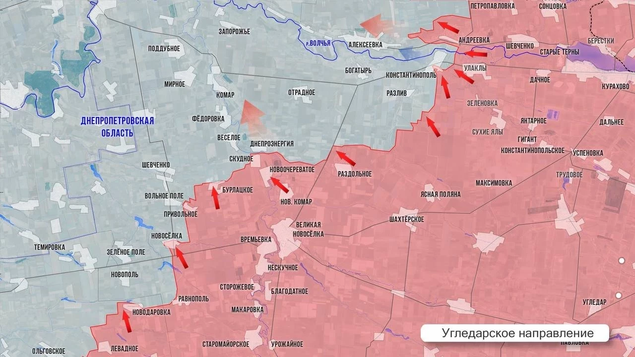 На Угледарском направлении ВС РФ развивают успех на широком участке фронта. После освобождения Бурлацкого наши продвинулись почти на 5 км на север к Весёлому. От Раздольного атакуют к Отрадному, а еще правее пытаются закрепиться на юго-восточной окраине Разлива. Ожесточённые бои идут в западной части Константинополя с прицелом на выход к менее укрепленным позициям ВСУ на востоке Богатыря. На северном участке фронта бои за восточные окраины Алексеевки и позиции ВСУ северо-восточнее.