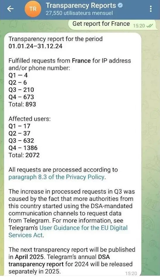 В частности, приводятся данные, согласно которым, только в последнем квартале прошлого года Дуров передал им данные почти на 1400 пользователей. Это, к слову, в два раза больше, чем за предыдущие девять месяцев.