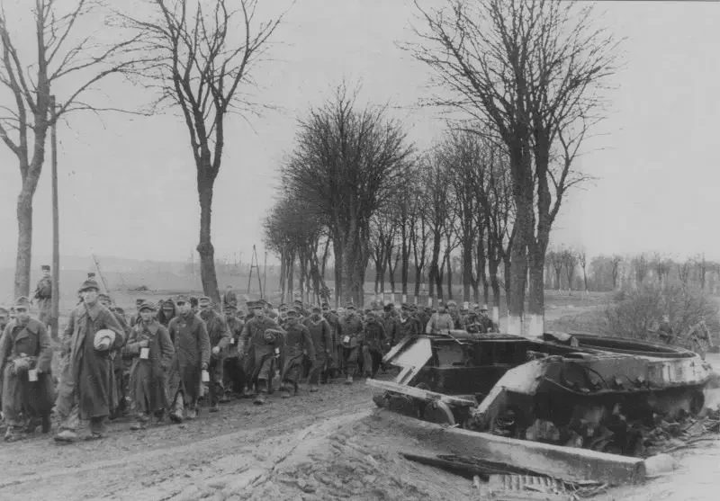 Колонна немецких пленных солдат проходит мимо остова разрушенного советского танка ИС-2. Венгрия, район озера Балатон. Апрель 1945 г.