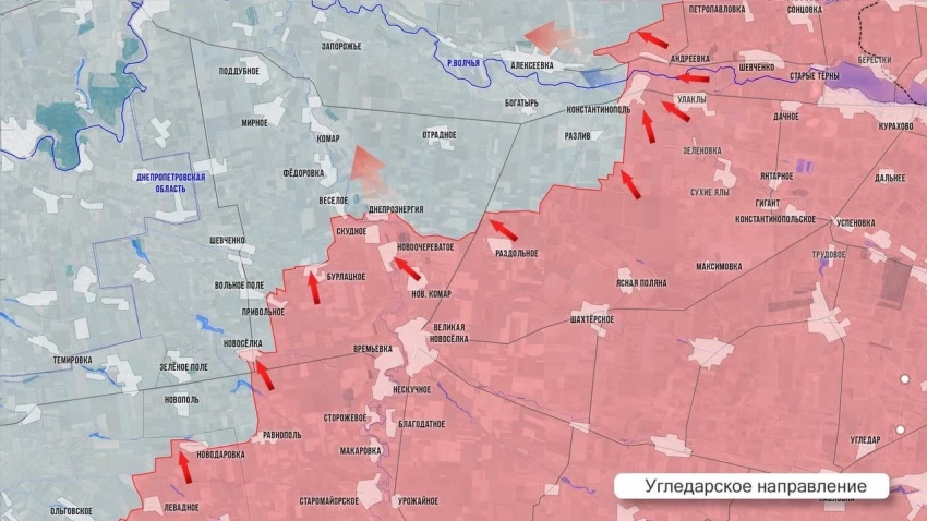 На Угледарском направлении клин, накануне вбитый нашими между Шевченко и Вольным Полем перерезал логистику ВСУ в Новосёлки и, по пока неподтвержденным данным, враг начал выход - ждём подтверждения. Со стороны Бурлацкого ВС РФ продвинулись больше чем на 1 км на север, в направлении на Весёлое. Это село наши бойцы атакуют с юго-востока. К западу от Константинополя продолжаются упорные бои. Наши войска штурмуют позиции ВСУ неподалёку от Разлива.