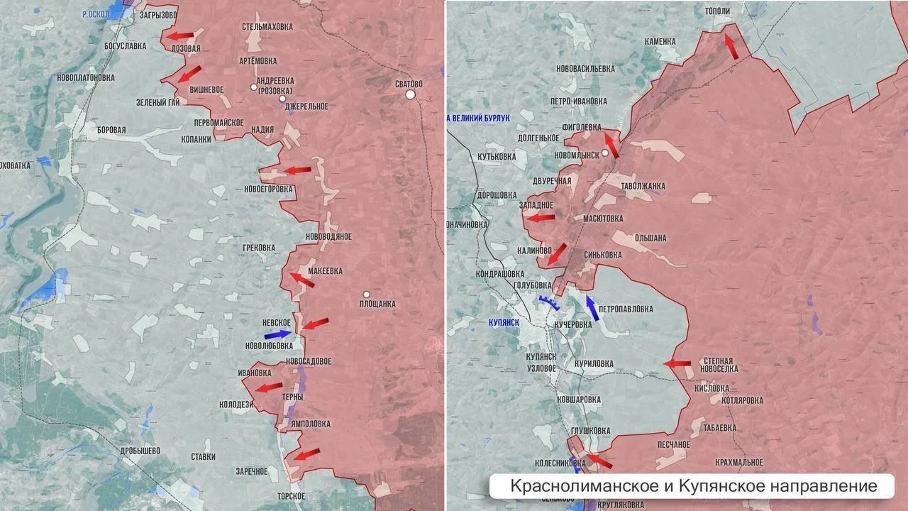 На Купянском направлении ВС РФ атакуют на разных направлениях. Есть тактические успехи в районе Кондрашовки, что чревато для ВСУ потерей части логистических путей, связывающих Купянск в Великим Бурлуком. Есть расширение подконтрольной территории в направлении на Каменку. Навстречу ВС РФ продвинулись на одну лесополку со стороны Тополей.