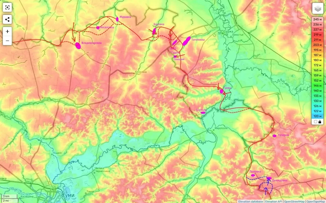 Однако продвижение затруднено: в районе Олешни идут ожесточенные бои, а освобождение села Гуево затягивается уже третьи сутки. Противник активно использует операторов дронов, которые значительно осложняют действия российских штурмовых групп.