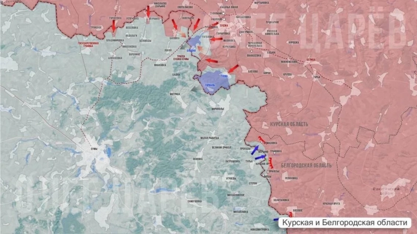 Telegram-канал "Северный ветер" сообщил о том, что на Сумском направлении Бесстрашные продолжают зачистку Гуево и окрестностей населенного пункта, а также ведут бои на подступах к хутору Олешня.