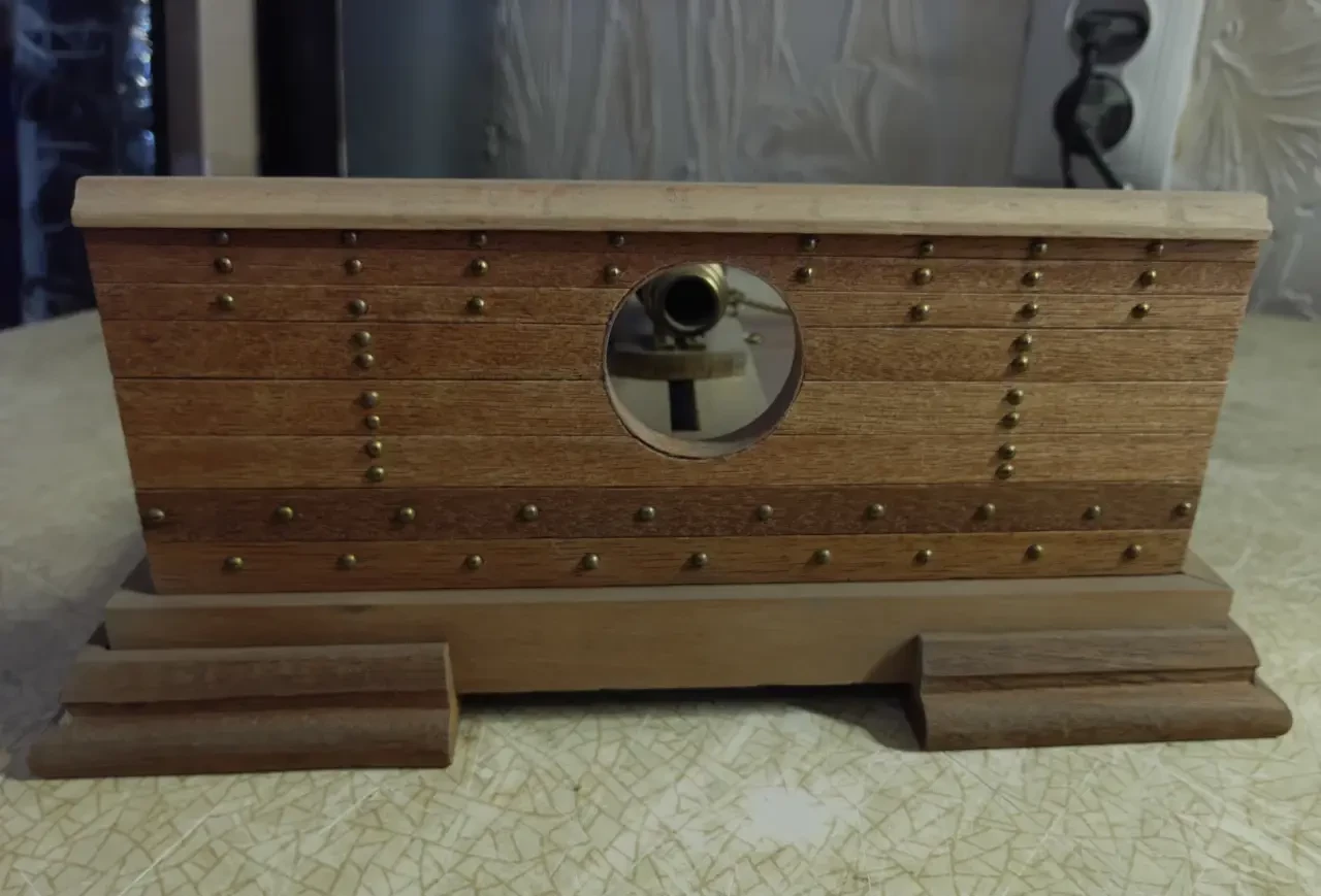 А вот это не просто кусок корабельного борта, а ещё и кусок палубы и корабельная пушка-карронада работы пензенского моделиста Ю. Пивкина, компания «Major Models». Мастерская работа, что и говорить, как и броневагон «Заамурец». Вот только ядра, на мой взгляд, уж очень «блескучие». Надо бы их превратить в «чугунные»…