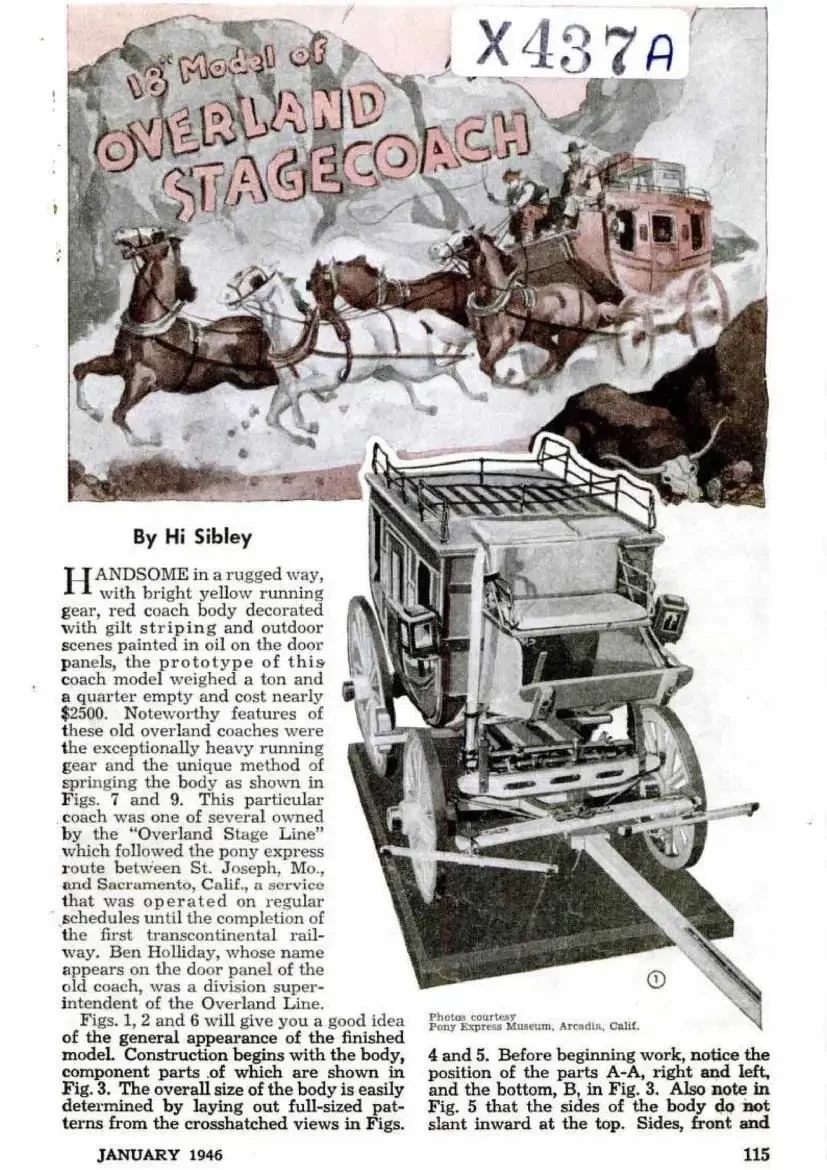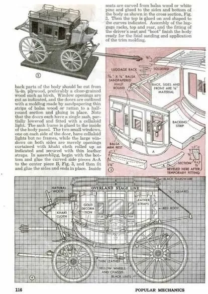 У каждой нации всегда был свой исторически сложившийся и потому любимый тип транспорта. В Англии и США таким транспортом стал дилижанс. Ну и, разумеется, его модель была предложена журналом «Популярная механика» для изготовления ещё в 1946 году. «Дилижанс» – культовый фильм 1939 года, «Гордость и предубеждение» (1995), ну и, разумеется, «Наш человек с бульвара Капуцинов» (1987), ну никак не могли обойтись без этого вида транспорта. В январском номере «Популярной механики» было опубликовано сразу несколько статей о том, как сделать его модель.