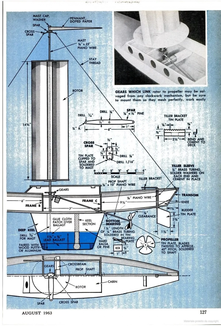 Ну а в случае с моделью всё просто: ветер вращает турбопарус, а от него вращение передаётся на гребной винт. Впоследствии точно такая же модель рекомендовалась к постройке и в журнале «Моделист-конструктор».