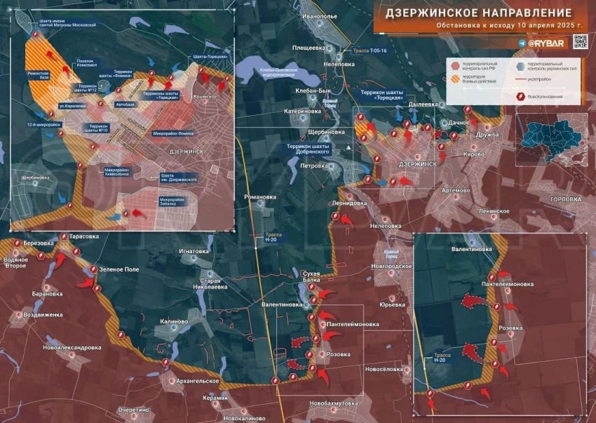 ▪️ Юго-западнее Торецка ВС РФ развивают наступление в районе Калиново. Ресурсы противника признают утрату большей части села, наши источники подчёркивают, что высоты к северу от села пока за противником. В Тарасовке продвижение даётся нашим очень трудно. А вот со стороны Александрополя и Валентиновки у наших есть динамика к трассе Н-20. В самом Торецке бои идут к западу от мкр. Забалка, в районе шахты «Центральной» и к северу от Дружбы, где за сутки ВС РФ продвинулись примерно на 500 м.