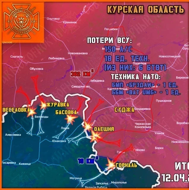 12 апреля весь день шли упорные бои на приграничных участках Курской области России и Сумской области Украины. По имеющимся данным, в Курской области подразделения ВС РФ проводили активные штурмовые действия по освобождению от ВСУ населенного пункта Горналь и территории Свято-Николаевского Белогорского мужского монастыря в этом селе, превращенном украинскими военными в настоящий укрепрайон.