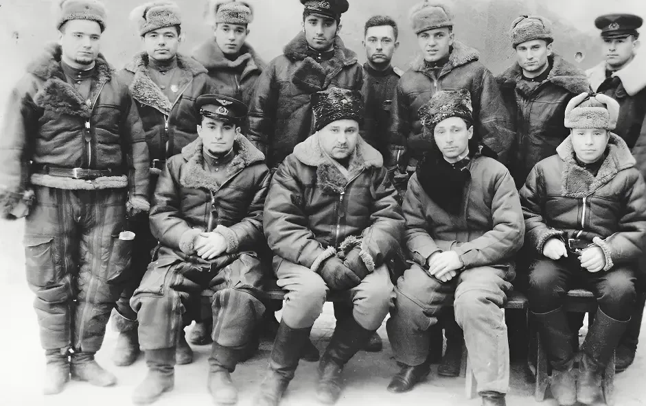 Амет-хан (сидит слева) среди командиров эскадрилий 303-й истребительной авиадивизии, осень 1944 г.