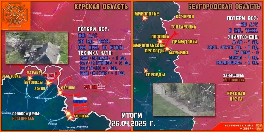 26 апреля группировка войск "Север" завершила освобождение последнего населенного пункта Курской области, где находились оккупанты и зачистила село Поповка в Краснояружском приграничье.