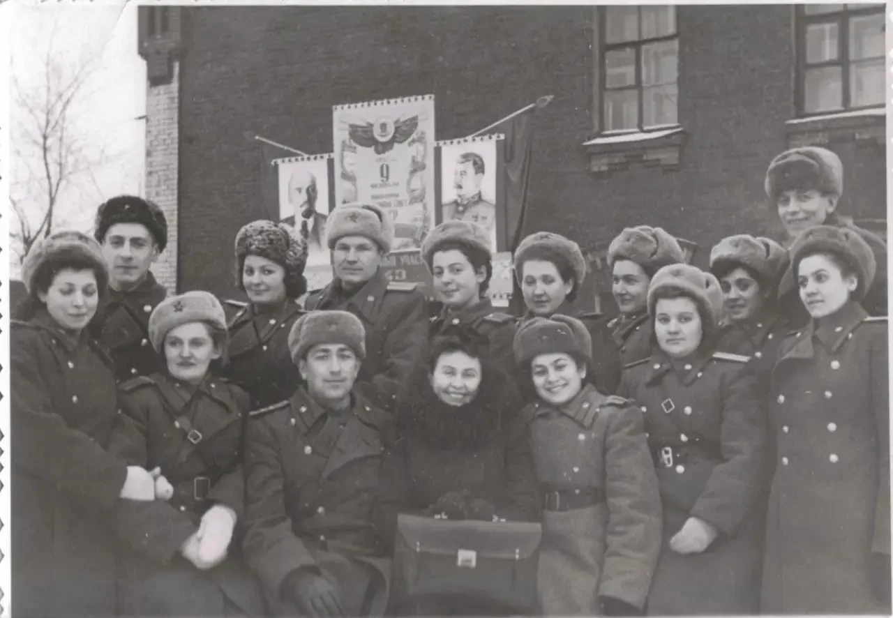 Командиры полков полтавского аэроузла и переводчица в центре, июнь 1944 года