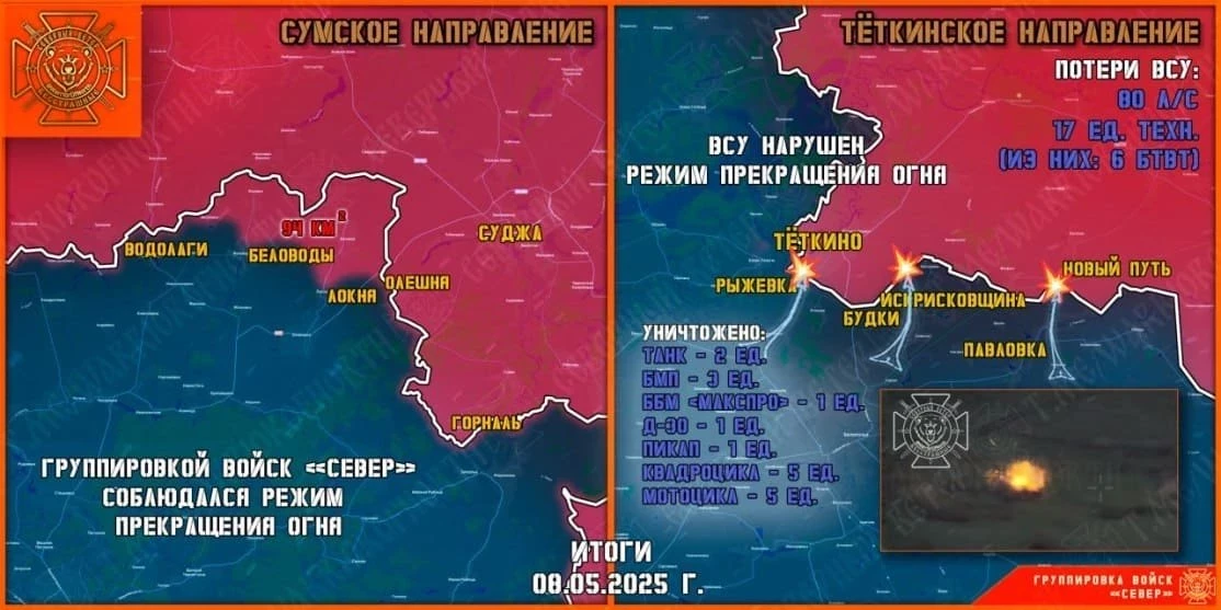 В настоящее время бойцы группировки войск "Север" завершают уничтожение просочившихся разрозненных групп противника. Наносится комплексное огневое поражение, враг пытается сбежать вглубь Сумской области.