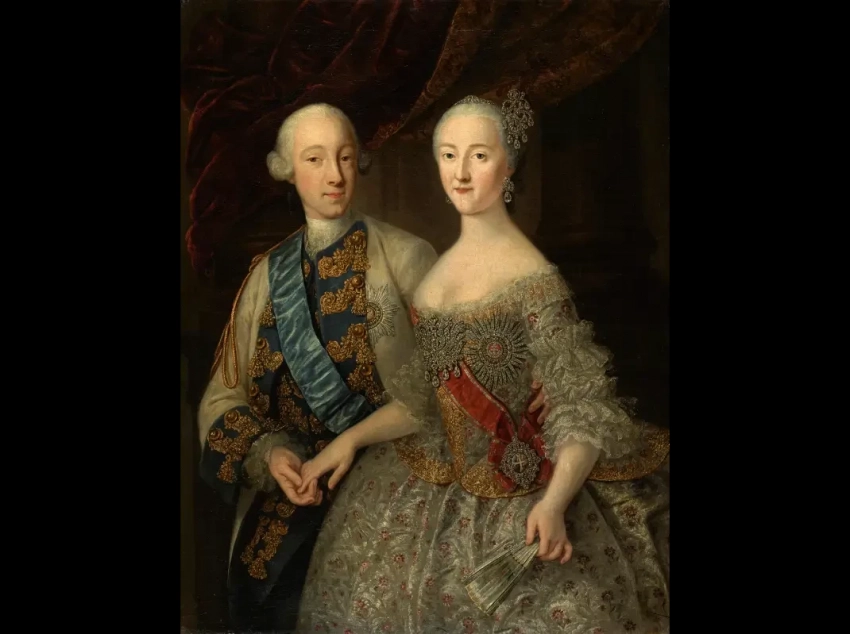 Великий князь Петр Федорович и его супруга, великая княгиня Екатерина Алексеевна. Свадебный портрет работы Г. Грота 1745 г. Михайловский замок. Зал 250. Покои Протасовой. «Галерея Романовых»