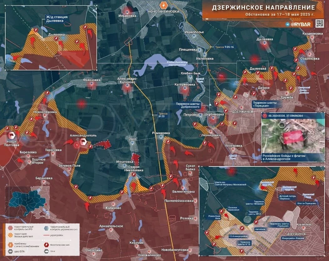 Западнее Торецка российские подразделения перерезали трассу на Константиновку в районе Новооленовки и продвигаются к Полтавке. По оперативным данным, наши войска, продвигаясь широким фронтом, вышли к окраинам Яблоновки. Восточнее наши бойцы ведут ожесточенные бои в большом кармане, пытаясь заблокировать ВСУ по рубежу Александрополь-Заря-Романовка. Для этого наши штурмуют Романовку и пробиваются к Заре. Этот клин опасен для ВСУ тем, что он угрожает Покровску с востока и формирует охват района Александро-Калиново -Клебан-Бык в предполье Константиновки. Восточнее Торецка идут бои в посёлке Дылеевка.