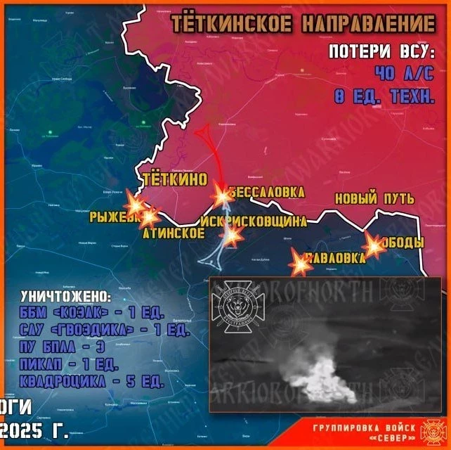 В районе Теткино противник продолжает упорно атаковать позиции ВС РФ, при этом полноценно закрепиться на территории села после ряда провальных попыток во время майского перемирия он так и не смог. Лишь разрозненные подразделения ВСУ сохраняют свое ограниченное присутствие в лесах на правом берегу реки Сейм.