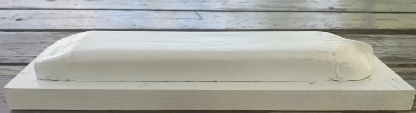 Заготовка корпуса из картона, бумаги и пластилина, покрашенная нитроэмалью и приклеенная на деревянный брусок