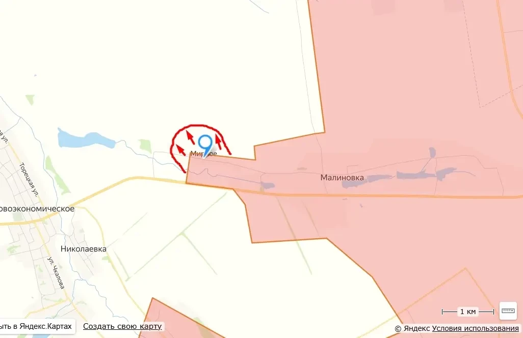 Поступают новые позитивные данные с территории Донецкой Народной Республики, освобождение которой продолжают наши военные. Международные OSINT-аналитики сообщают о переходе под контроль Армии России села Мирное в ДНР, которое расположено на трассе Покровск-Константиновка западнее ранее освобождённой Малиновки.