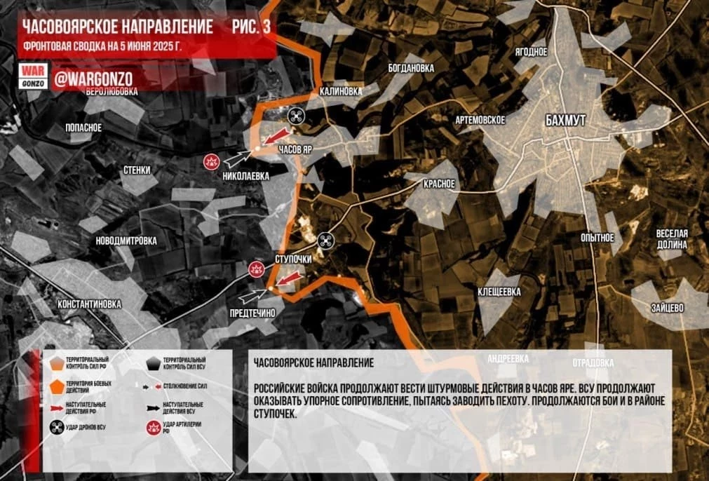На ЧасовЯрском направлении российские войска продолжают вести штурмовые действия в Часов Яре. ВСУ продолжают оказывать упорное сопротивление, пытаясь заводить пехоту. Продолжаются бои и в районе Ступочек.