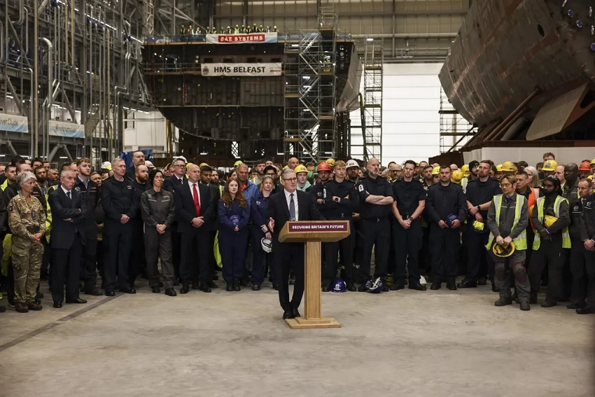Фото 2. Премьер-министр Кир Стармер дает пресс-конференцию во время посещения им и министром обороны Джоном Хили церемонии спуска на воду фрегата HMS Glasgow, а правительство представляет свои планы расходов на оборону.