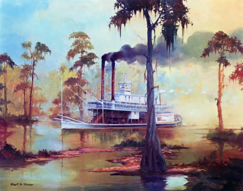 По каким только узким притокам Миссисипи не приходилось пробираться «пароходам Тома Сойера». «Пароход «Куахита» ночью». Картина Роберта М. Раклера.