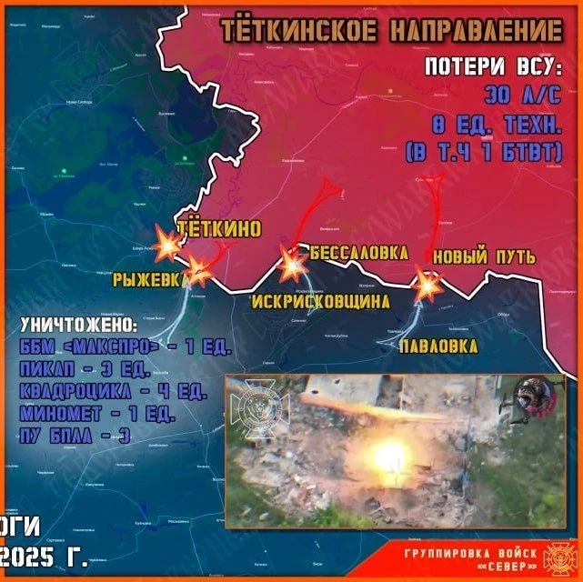 Командование ВСУ продолжает отправлять на убой свои штурмовые группы на Тёткинском и Глушковском направлениях. Бойцы группировки войск "Север" перемалывают личный состав противника, уничтожая оккупантов в глубине украинской территории и в районе госграницы.