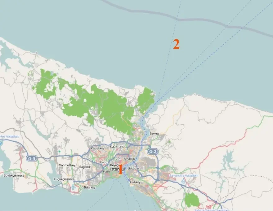 Место стоянки «Струмы» в Стамбуле» (1) и место ее гибели (2)